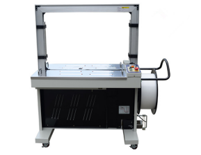 全自动打包机 MH-101A(自动捆扎机)可以实现自动打包,但因为台面无动力,所以需要人工推一下包装物品才能通过打包机。这款全自动打包机使用打包带缠绕产品或包装件,然后收紧并将两端通过热熔连接。